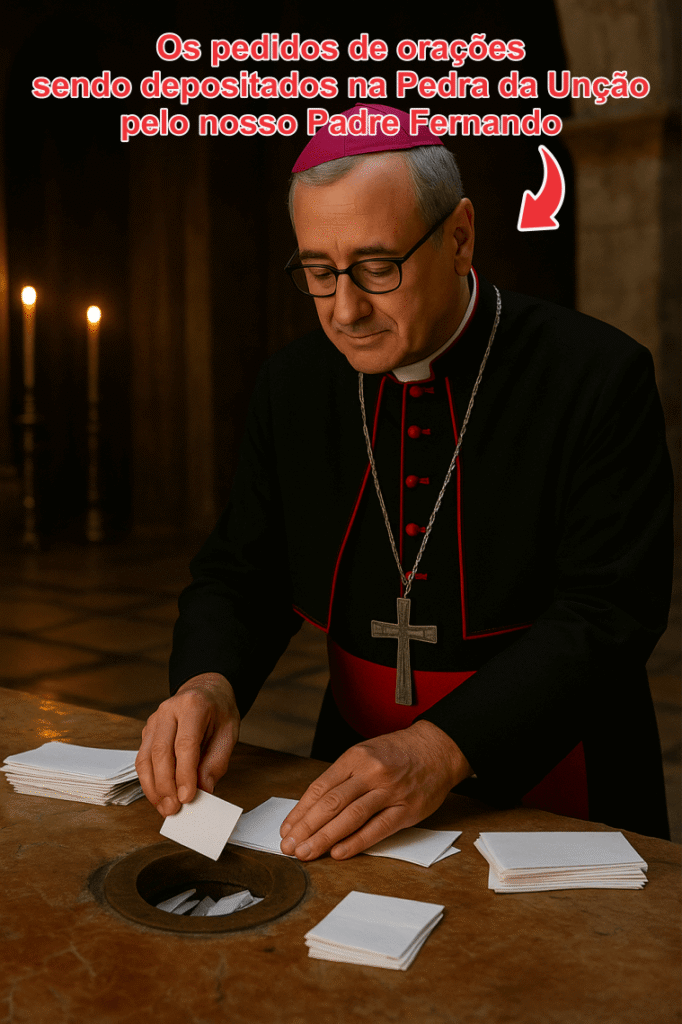 Ao enviar sua oração à Pedra da Unção, você se junta a inúmeros outros que buscaram a graça divina neste lugar sagrado. Conforte-se em saber que sua oração foi depositada em um lugar tocado pelo corpo de Jesus Cristo, onde milagres fazem parte da vida cotidiana.