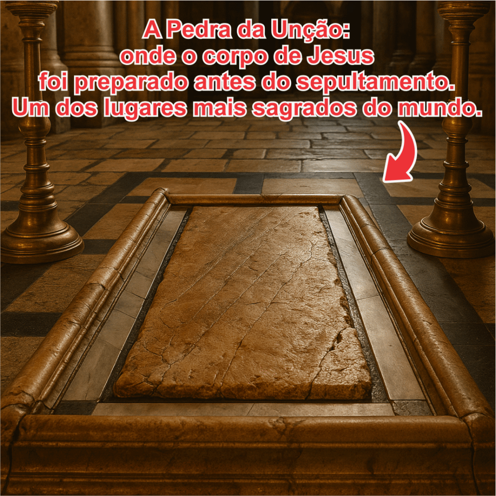 A Pedra da Unção, localizada em Jerusalém, é um dos locais mais sagrados do mundo Foi exatamente sobre ela que o corpo de Jesus foi preparado com óleos e perfumes antes do sepultamento.